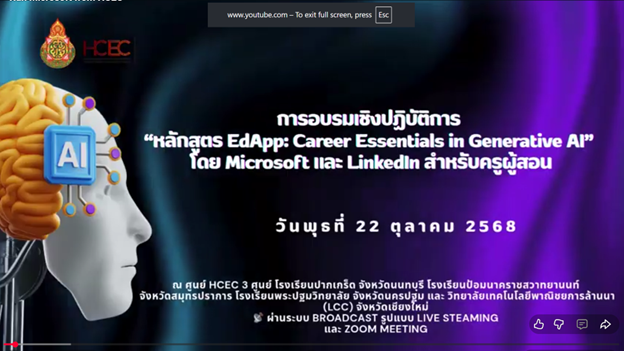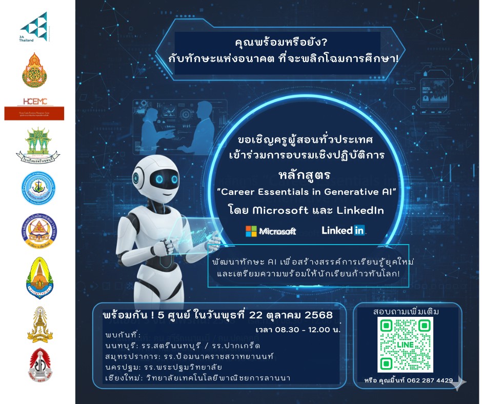 Invitation to Join the Workshop: Advancing Future Skills through the “Career Essentials in Generative AI” Program Junior Achievement Thailand, in collaboration with the Human Capital Excellence Center (HCEC), invites all teachers and educational personnel to participate in a hands-on workshop aimed at expanding knowledge and impact from the “Career Essentials in Generative AI” program by